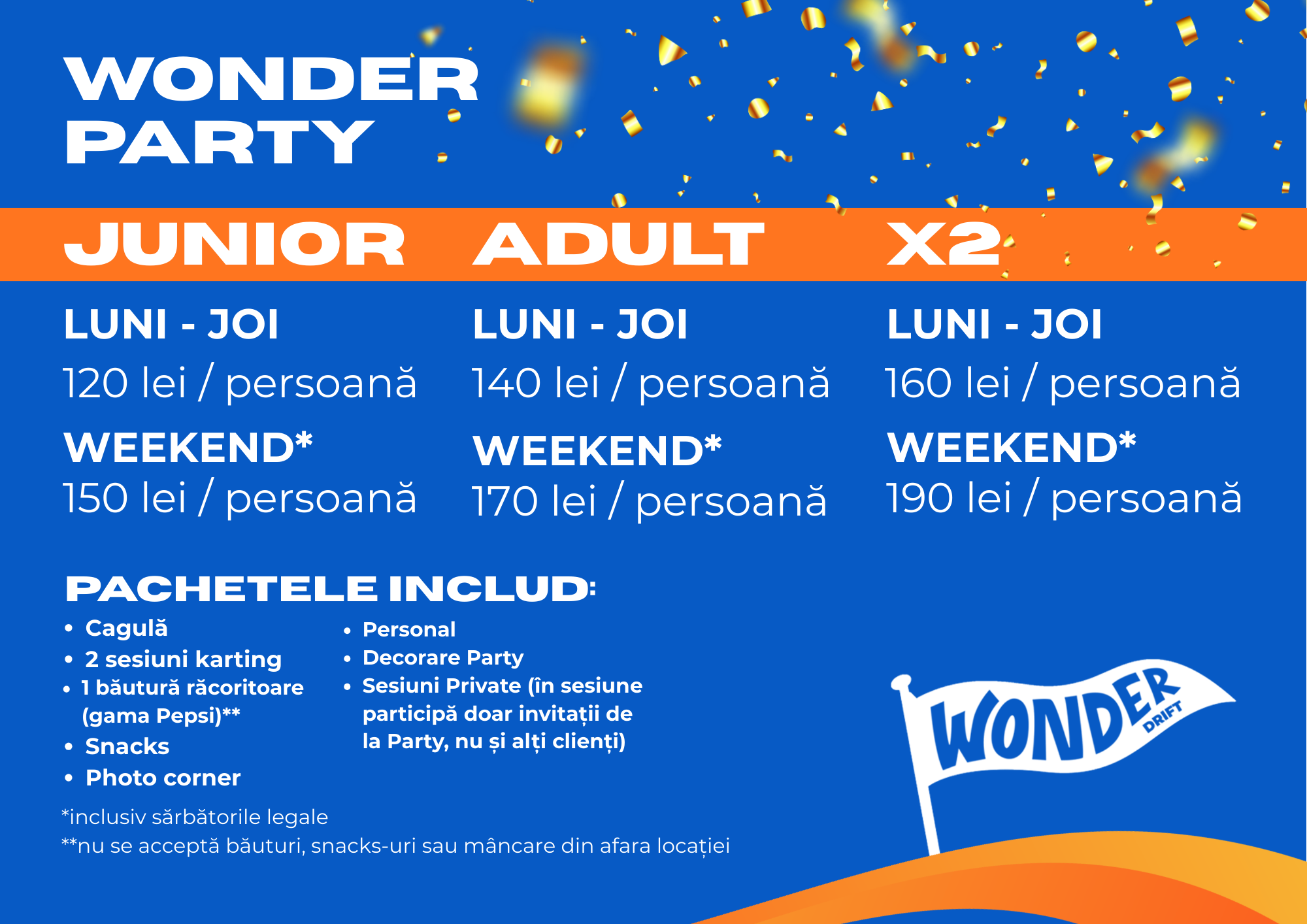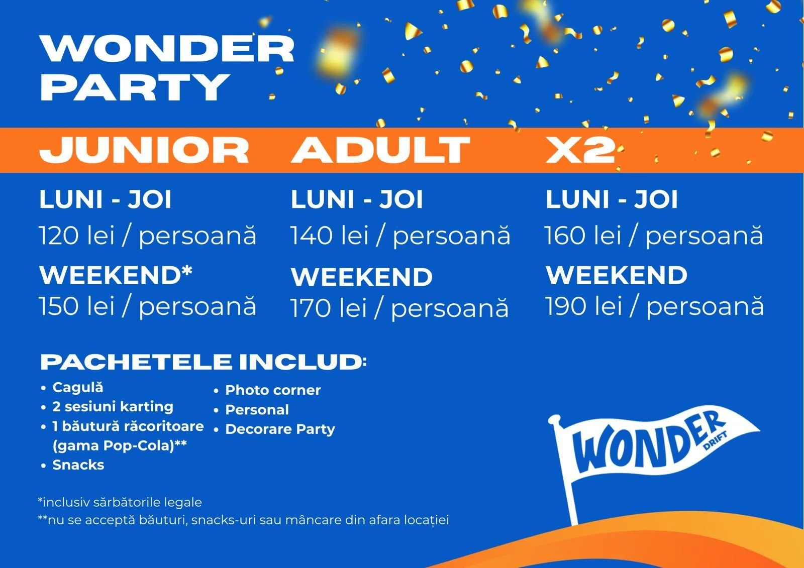 Perfecte pentru aniversări, team building relaxate sau ieșiri între prieteni. Pachetele pornesc de la 120 lei/persoană (copii), 140 lei/persoană (adulți), 160 lei/pachet pentru karturile duble și includ 2 sesiuni de karting, cagulă, o băutură răcoritoare și un snack la bar.